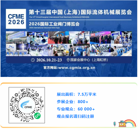 2026年10月21-23日,两年一届第十三届中国(上海)国际流体机械展览会(CFME2026)将在上海国家会展中心举办。