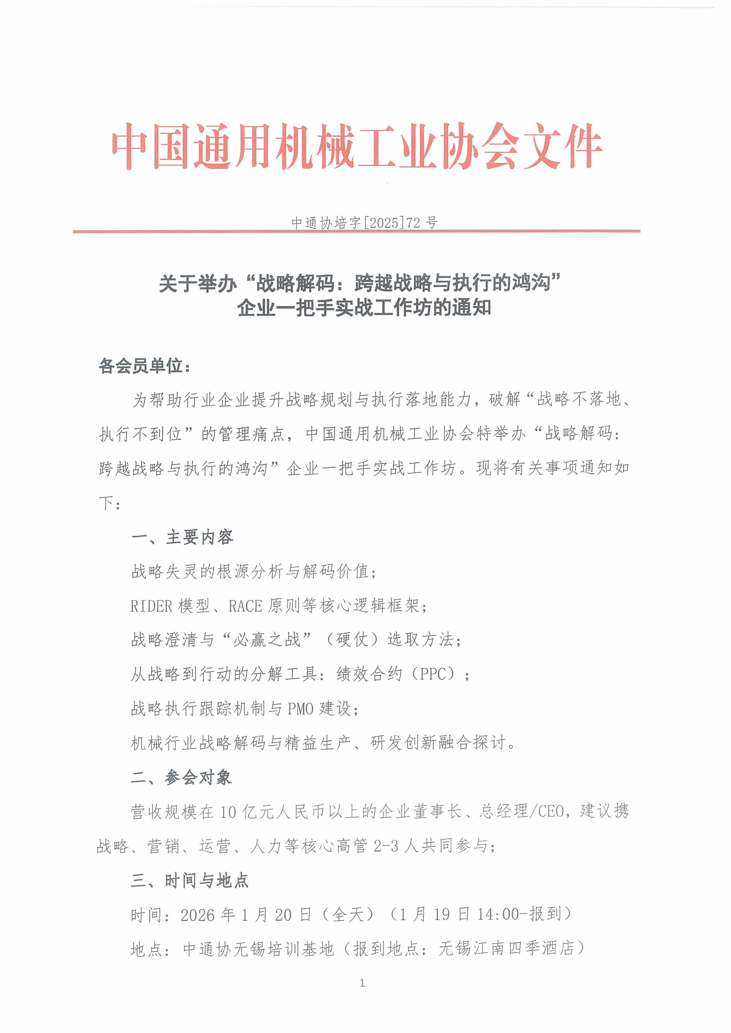 关于举办“战略解码:跨越战略与执行的鸿沟”企业一把手实战工作坊的通知