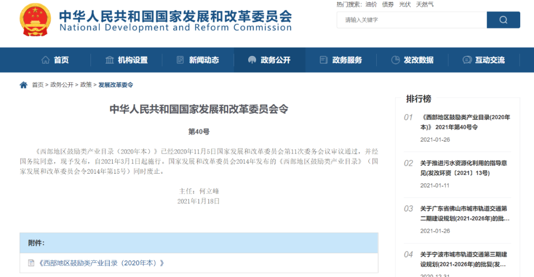 近日,国家发展改革委官网公布《西部地区鼓励类产业目录(2020年本)》,自2021年3月1日起施行。西部地区鼓励类企业减按15%税率征收企业所得税。