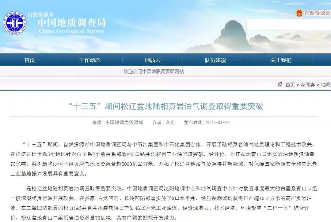中国地调局资源部官网近日发布消息,“十三五”期间,自然资源部中国地质调查局与中石油集团和中石化集团合作,开展了陆相页岩油气地质理论和工程技术攻关,在松辽盆地优选5个地区针对白垩系2个新层系部署的5口钻井均获得工业油气流突破。