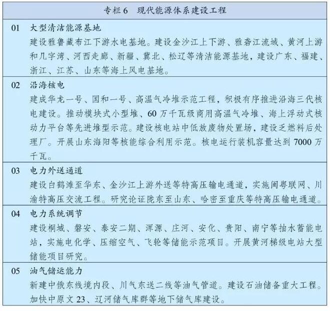 沿海核电:“十四五”规划图技术路线上提及的华龙一号、国和一号、高温气冷堆示范工程,都是中国拥有自主知识产权的核电型号。积极有序推进沿海三代核电建设。推动模块式小型堆、60万千瓦级商用高温气冷堆、海上浮动式核动力平台等先进堆型示范。建设核电站中低放废物处置场,建设乏燃料后处理厂。开展山东海阳等核能综合利用示范。核电运行装机容量达到7000万千瓦。