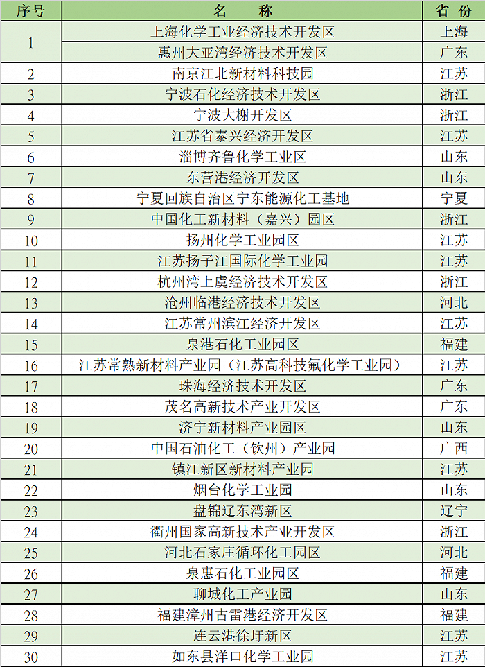 2021年中国化工园区30强名单。名单来源:中国石油和化学工业联合会化工园区工作委员会