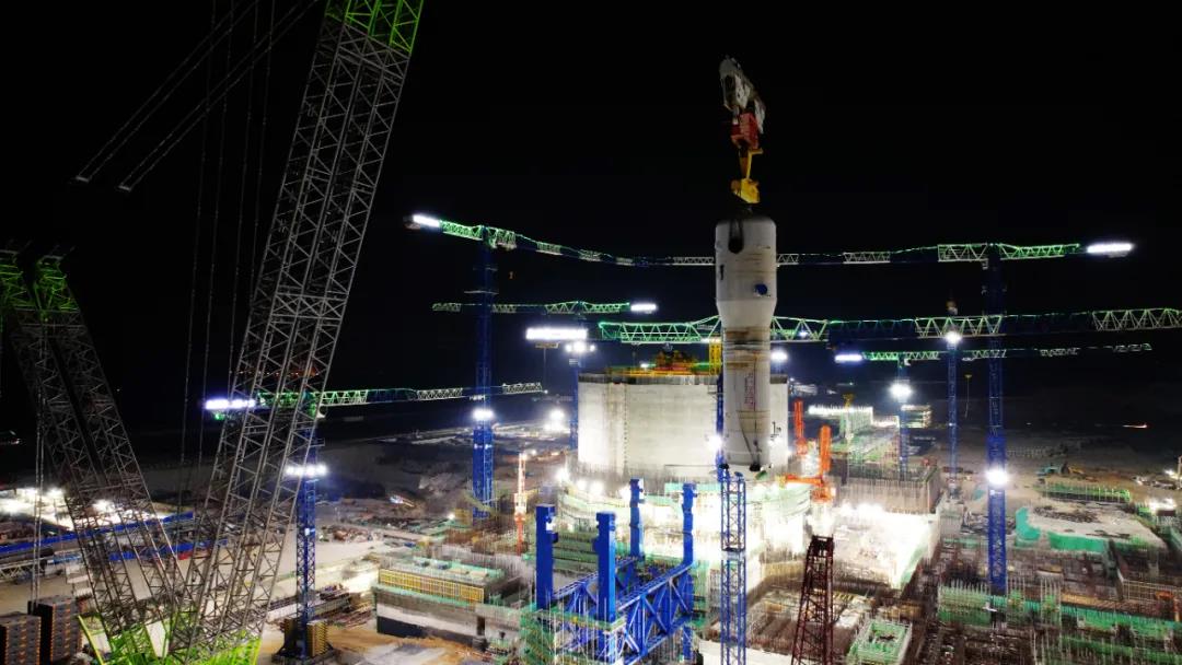 核岛主设备先行引入法施工,是在穹顶吊装前,采用大型履带吊将主设备(包括压力容器、蒸发器、主泵泵壳、稳压器,以及设备就位前所需支撑)引入反应堆厂房,改变以往核电机组传统的先土建后安装的顺序施工模式,转变为土建、安装平行施工模式,与常规方法相比在主回路关键路径上节省等待环吊可用的时间,从而使主回路的安装工作提前开始,可大幅节约核电项目的施工工期。中核集团漳州核电项目管理大团队为确保核岛主设备先行引入工作顺利推进,成立了主设备先行引入专项小组,联合中核工程、中核咨询、中核二三等相关单位,以周、日例会机制第一时间协调解决了工程推进中遇到的各种制约问题。同时以党建为引领,成立主设备先行引入党员突击队,以党员为骨干力量,夜以继日冲锋在前,有效保障目标实现。