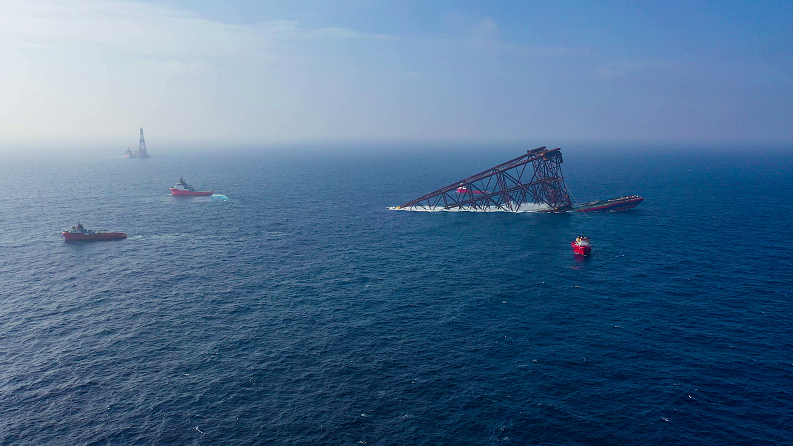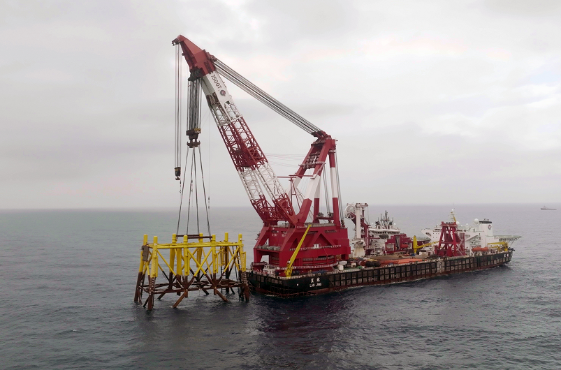 导管架平台是全球应用最广泛的海洋油气生产设施,导管架相当于“基座”,将巨大的平台托举在海面上。由于“海基一号”的吨位超过世界最大浮式起重船的吊装能力,此次海上安装采用滑移下水方式进行。这种方式是利用导管架自身重力并配合液压千斤顶助推,使导管架从驳船平稳地滑入海中,再通过起重船将导管架吊装扶正坐底,从而实现安装就位。