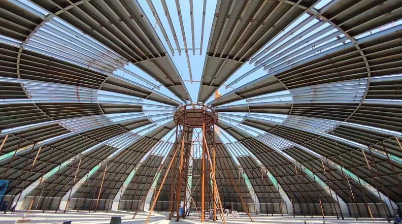 中国海油盐城“绿能港”项目副总经理袁斌向记者介绍,针对全球最大27万方储罐拱顶模块跨度长、重量大的特点,项目组通过精密计算、模拟推演及现场试验,在每个拱顶模块表面分为上、中、下合理布置3组共8个吊点,起吊前,通过调整8根钢丝绳长度,使每组钢丝绳的夹角保持固定,确保吊装过程中拱顶模块变形量控制在5%以内,保障了施工质量。