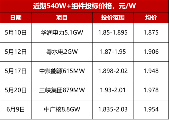 从5月开始,组件价格开始明显上涨,5月15日以后,540W及以上组件价格上涨0.08元/W,厂家报价集中至1.95元-2元/W,且企业最高报价已达2.03元/W,投标均价已达1.96元/W。
