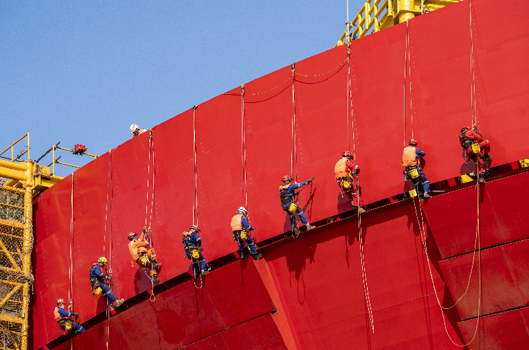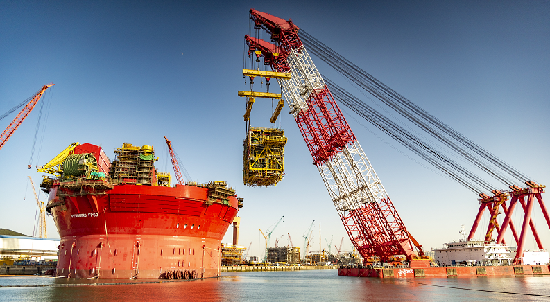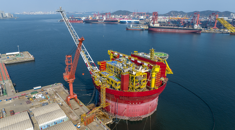 与常规FPSO船型相比,圆筒型FPSO生产工艺更复杂、空间布置更紧凑、集成化程度更高、施工技术要求更严格。据海洋石油工程(青岛)有限公司副总经理李家伟介绍,自2018年开工以来,项目团队相继攻克导缆器超高精度安装、狭小空间吊装集成等施工难题,突破5项国内首次应用技术,实现20余项工艺创新,集成速度和精度达到世界先进水平。企鹅FPSO的交付,标志着我国全面掌握所有船型浮式生产储卸油装置的建造及集成总装技术。