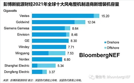 在彭博新能源财经公布的2021年全球风电整机商排名中,中国风电整机商已占据了前十名中六个席位,维斯塔斯、金风科技、西门子歌美飒、远景能源、通用电气位列前五,后面依次为运达股份、明阳智能、恩德能源、电气风电、东方风电。
