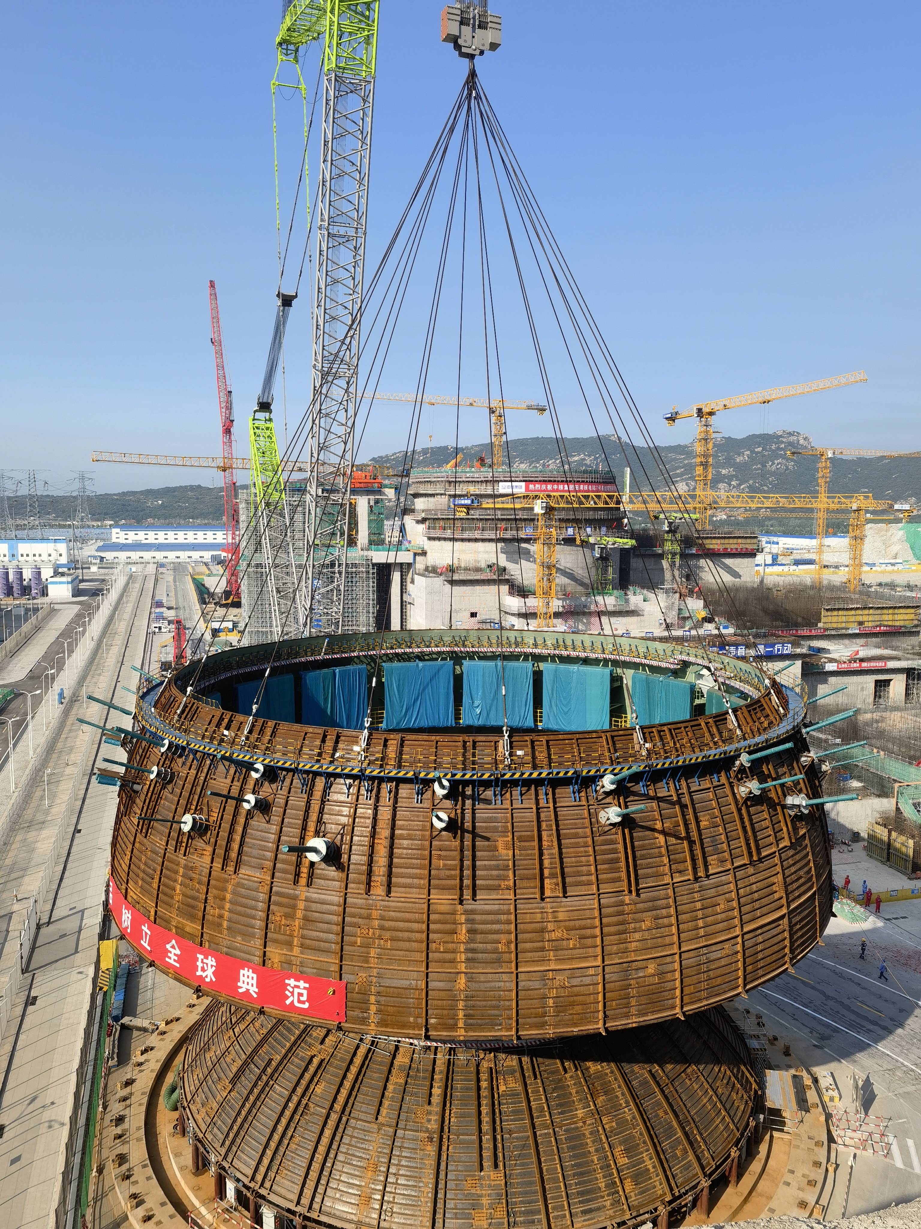 田湾核电站7号机组穹顶吊装分为球带和球冠两个部分。此次吊装的球带为环带型结构,上口直径36.522米,下口直径44米,高度12.269米,球带内分布着不同规格的安装设备,包括16台穹顶非能动热交换器、44件贯穿件、4台氢气复合器等设备。