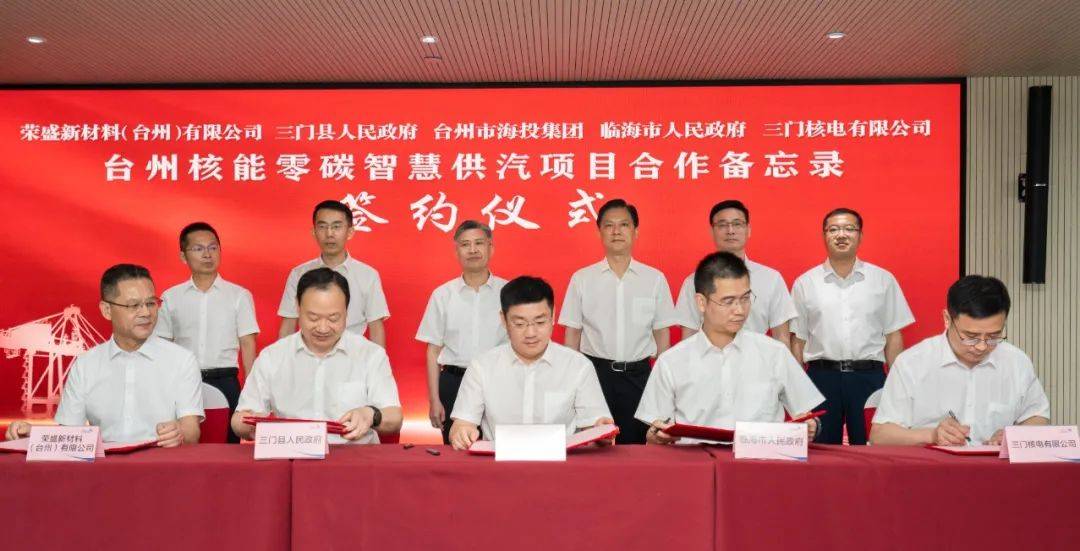 6月21日,三门核电有限公司与台州市海投集团、临海市人民政府、三门县人民政府、荣盛新材料(台州)有限公司共同签署了《台州核能零碳智慧供汽项目合作备忘录》,全面落实国家绿色低碳发展战略,推动核能综合利用产业的多元化发展,助力浙江省重大项目建设。