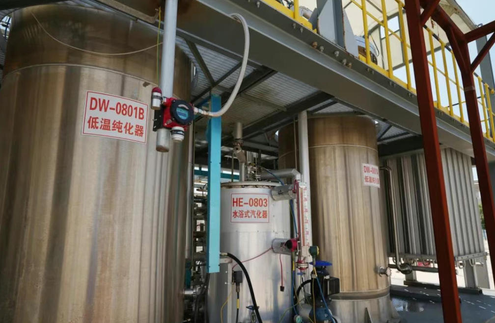 中科富海自主研发的LNG-BOG低温提氦装置,采用低温分离方法提纯氦气。BOG提氦过程由原料气计量单元稳流系统、催化脱氢/脱水系统、粗氦提取系统、低温纯化系统、氦气充装系统等组成。含氦原料气首先经过调压稳流后,送入催化脱氢/脱水系统脱除氢气;脱氢后的气体进入粗氦提取系统,得到纯度约95%的粗氦气;再经中压低温吸附纯化系统深度净化杂质,最终产出符合国家标准的5N高纯氦气。该装置由中科富海独立开发、自主集成,项目投产后预期可实现年产16.65万方高纯氦气产品。