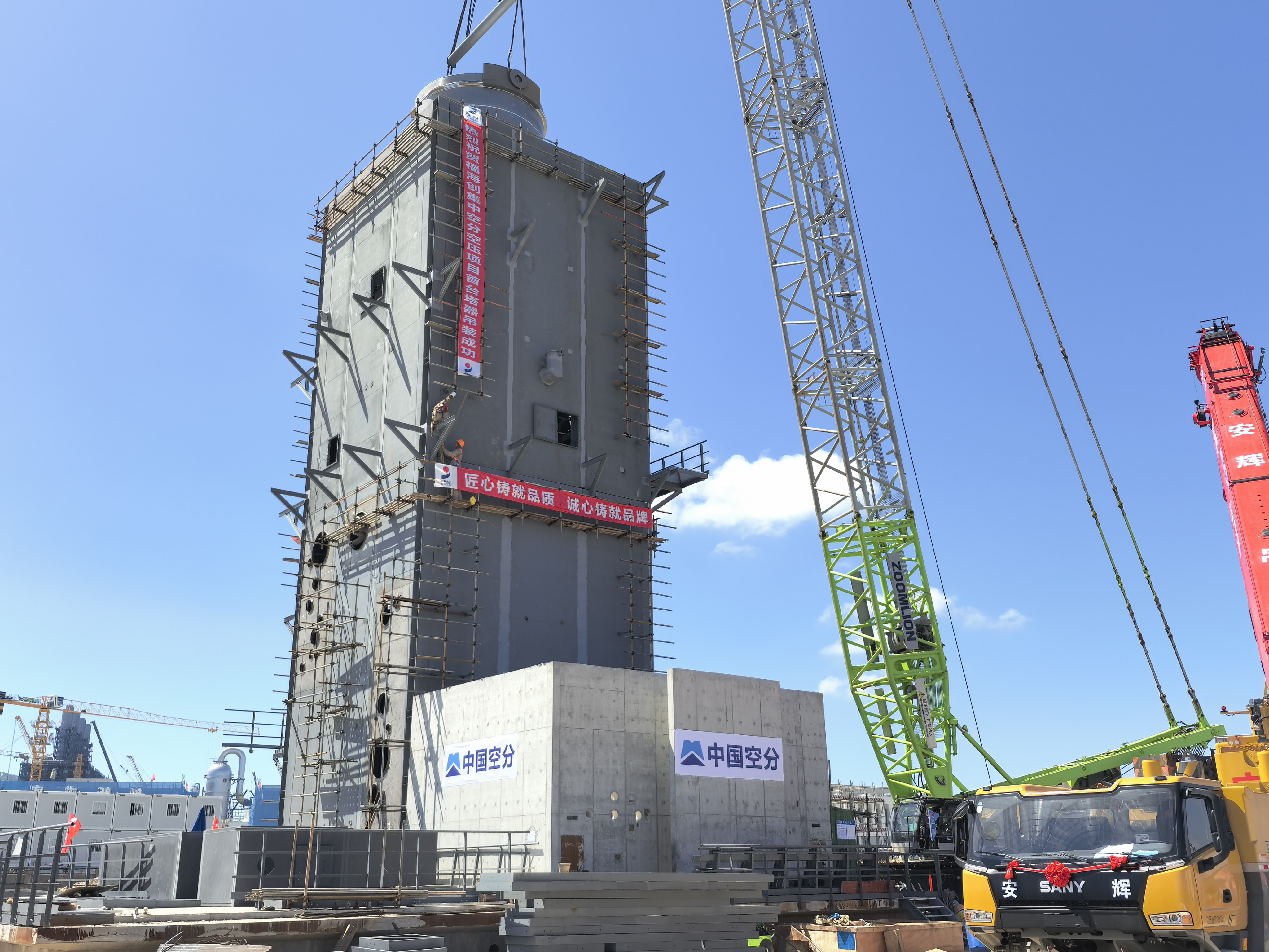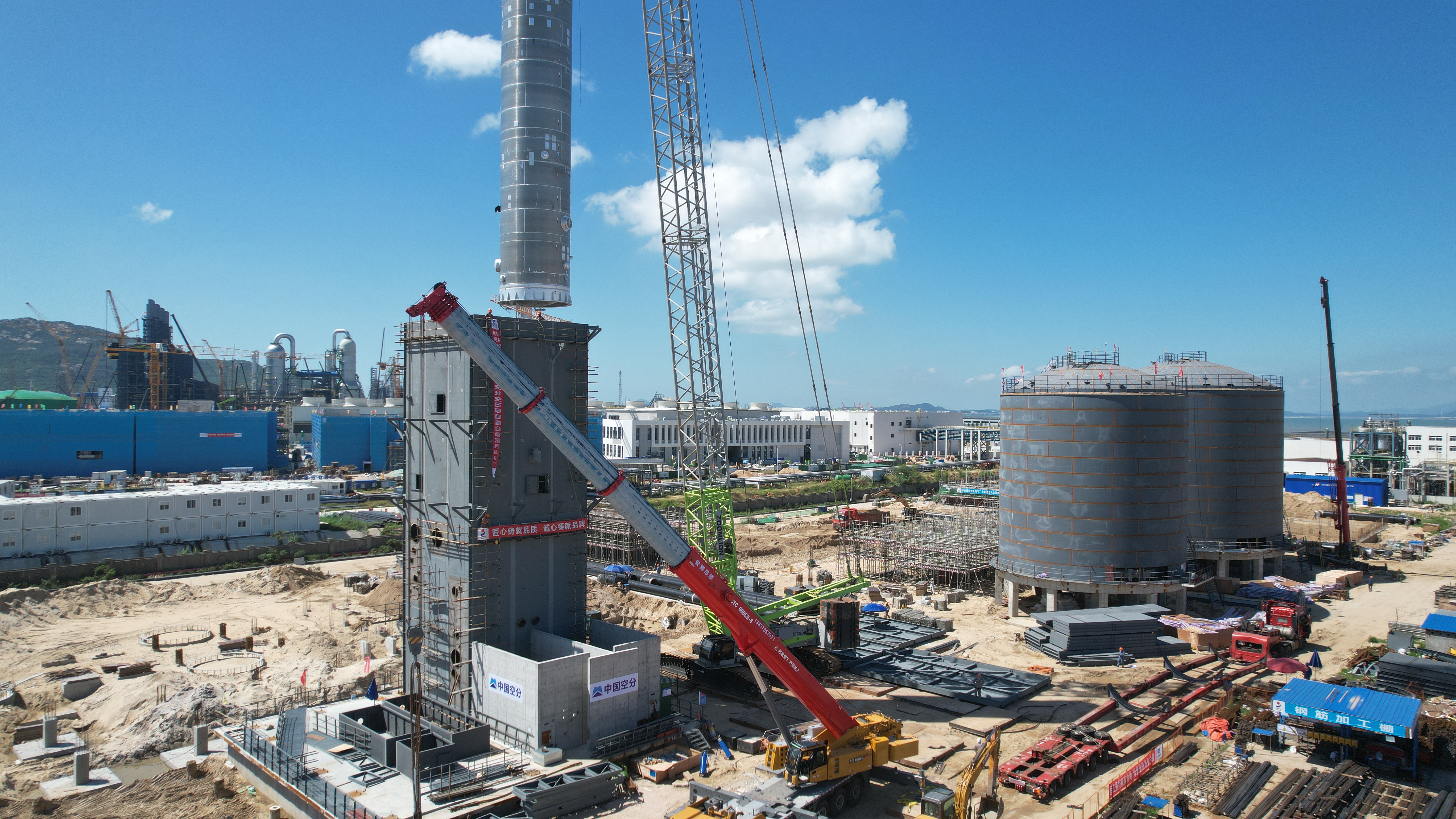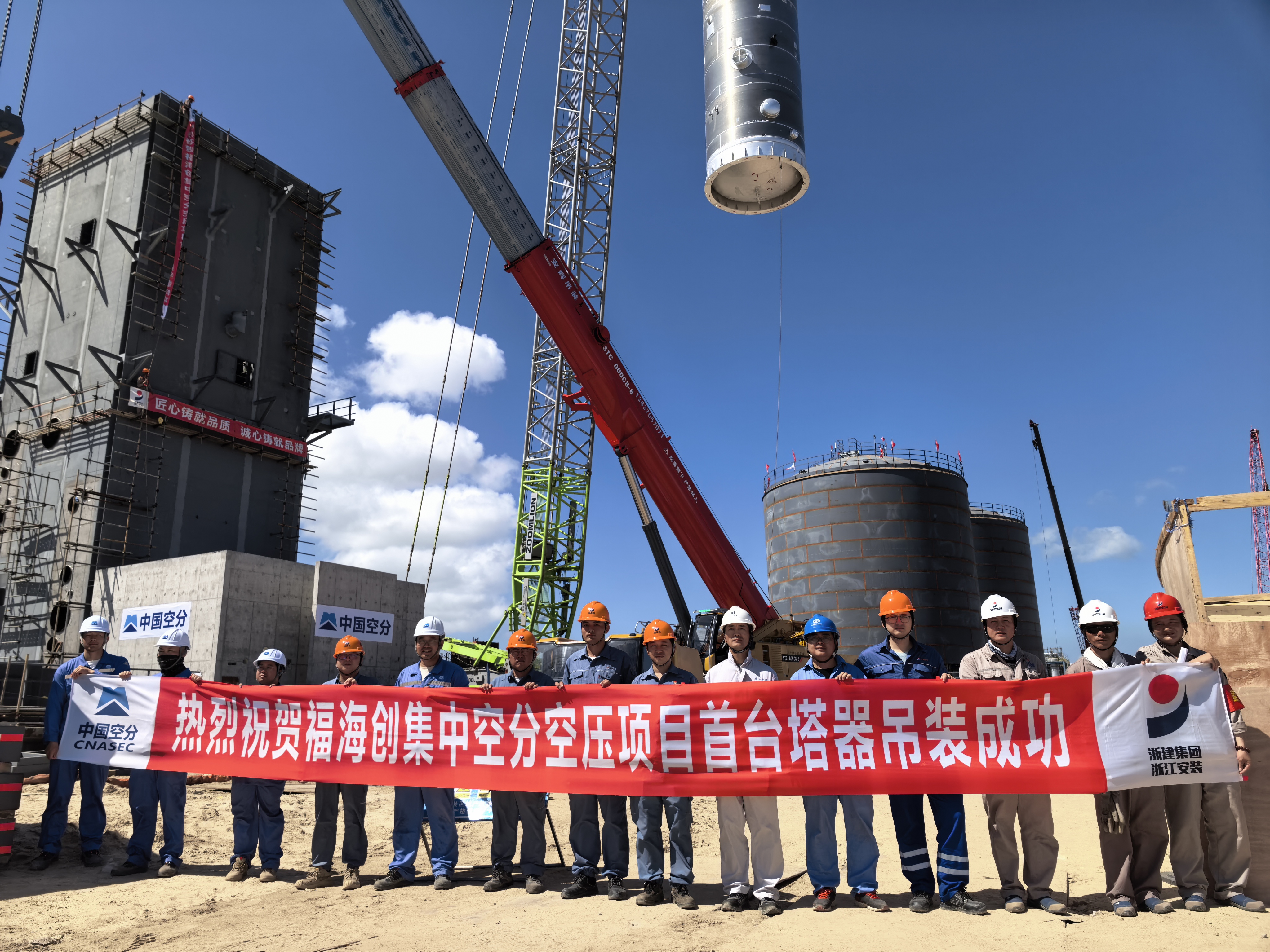 近日,中国空分工程有限公司(以下简称“中国空分”)承接的福建福海创7万集中空分空压装置EPC总承包项目现场,再度传来振奋人心的捷报!项目核心装置冷箱的首台大型塔器设备,成功完成一次性精准吊装,这一关键进展标志着项目全面进入关键设备安装阶段,为整个项目建设迈出了具有里程碑意义的一步。