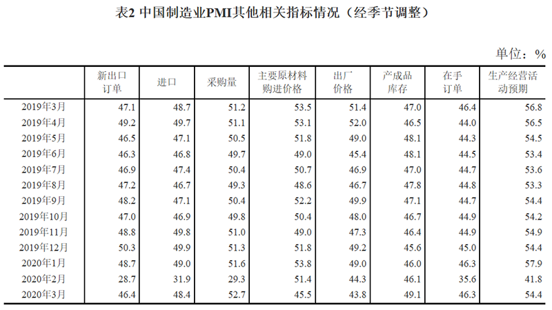 虽然3月份制造业PMI大幅回升,但调查结果显示,企业生产经营压力仍然较大,本月反映资金紧张和市场需求不足的企业比重分别为41.7%和52.3%,比上月上升2.6和4.1个百分点。从外部环境看,疫情在全球快速蔓延,世界经济贸易增长受到严重冲击,给我国经济带来新的严峻挑战。3月份我国制造业新出口订单指数和进口指数分别为46.4%和48.4%,虽环比有所回升,但处于较低水平。