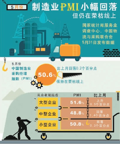 中国物流与采购联合会、国家统计局服务业调查中心5月31日发布,5月份中国制造业采购经理指数(PMI)为50.6%,较上月小幅下降0.2个百分点,保持在50%以上,经济保持恢复性增长势头。从分项指数来看,市场需求保持回升,企业复产保持稳定,势头稍有放缓,就业活动也相对稳定。新动能保持较快恢复势头,大型企业继续保持较好支撑作用,企业对后市预期趋升。